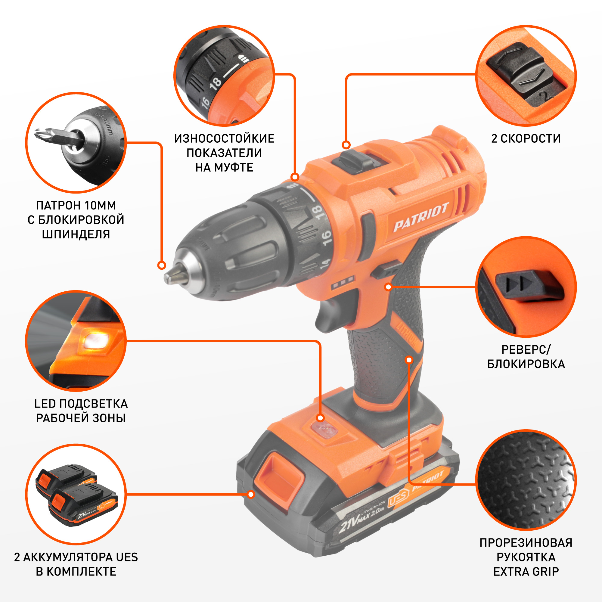 В комплекте 2 аккумулятора UES (21В, 2,0 А*ч).