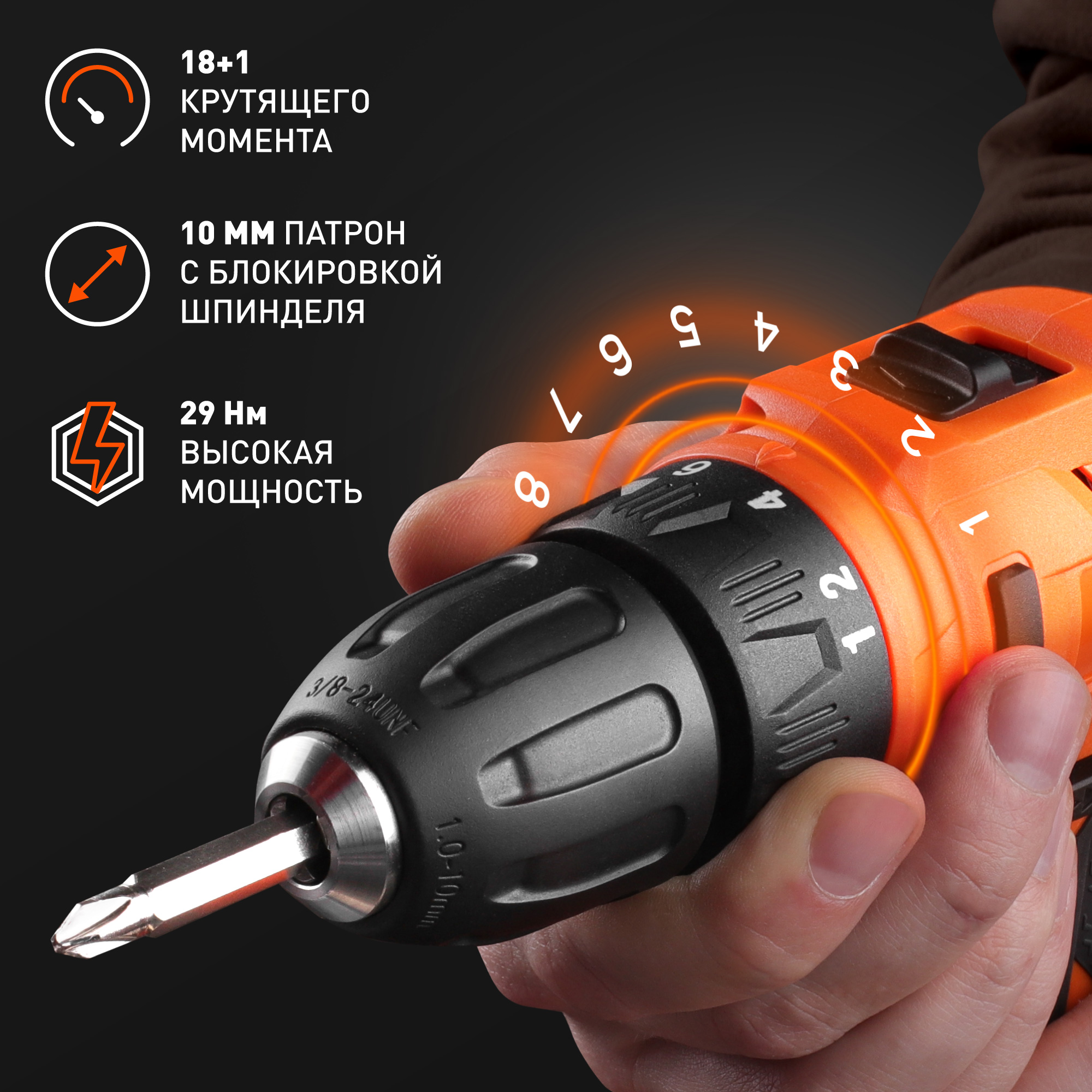 Наличие блокировки шпинделя позволяет удобно менять насадки в быстрозажимном патроне на 10 мм.