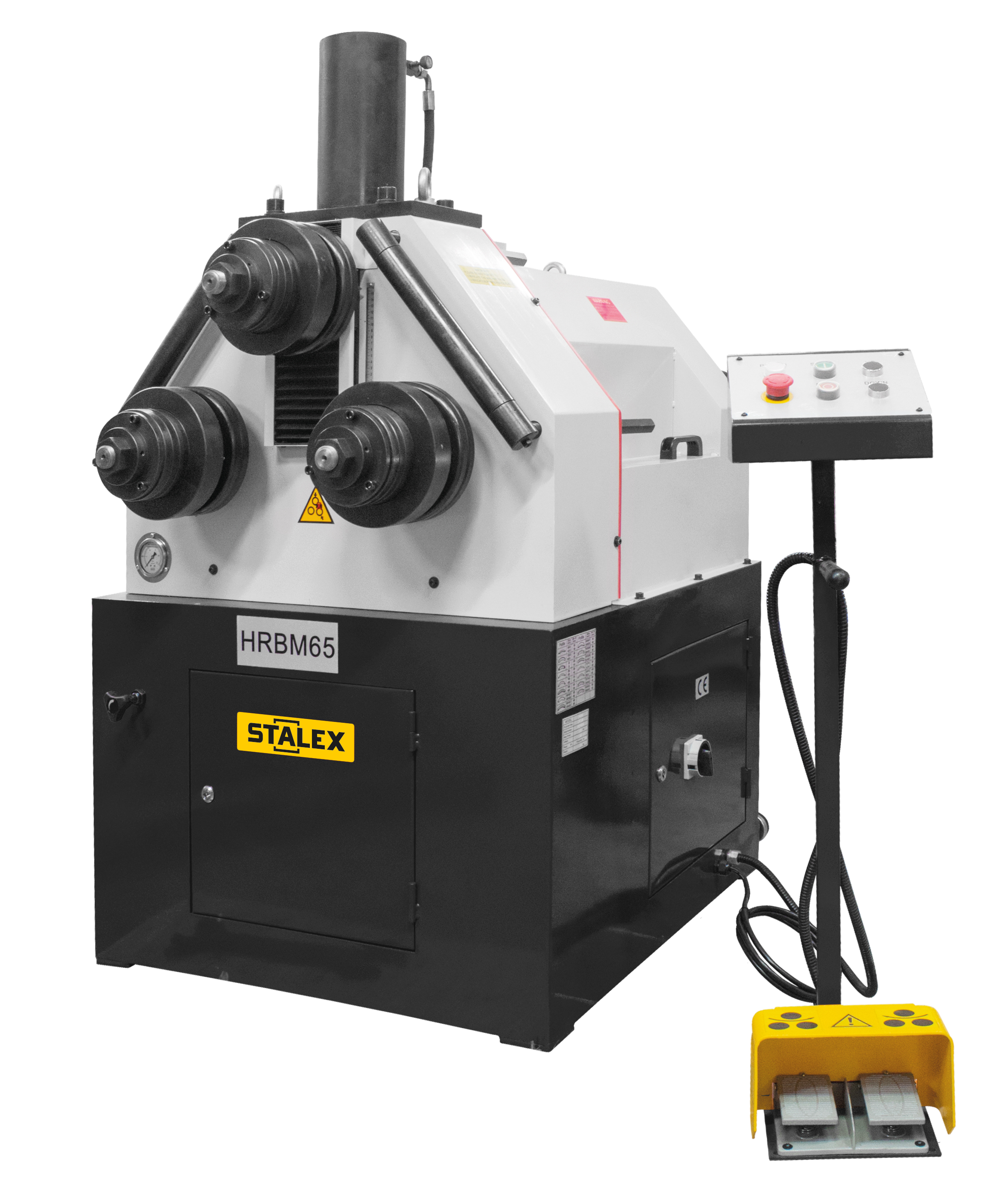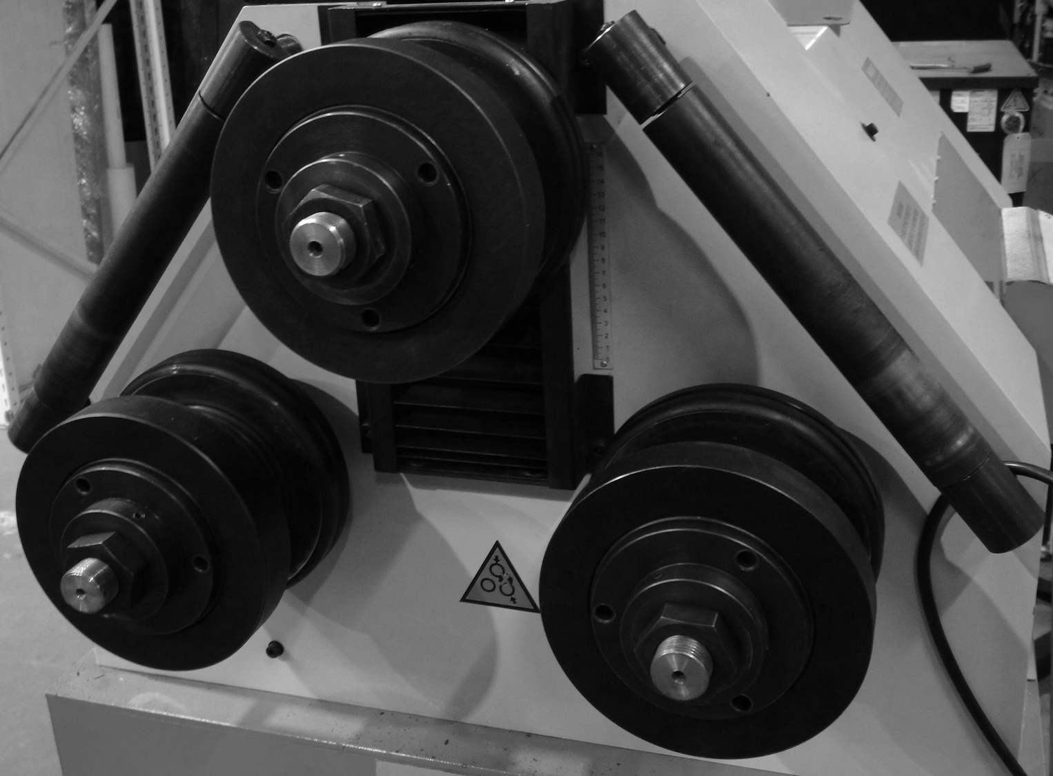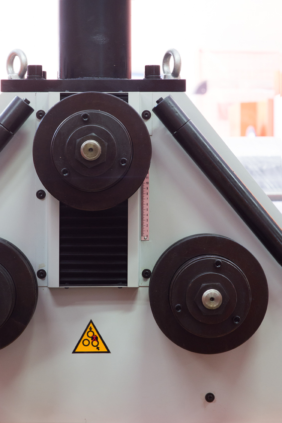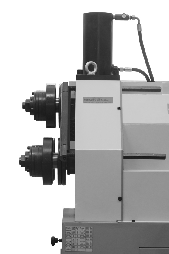 Усиленная конструкция для длительного срока службы, с 2-мя приводными роликами + гидравлический привод верхнего вала. Изменена конструкция в 2022г. с трёх приводных роликов на два приводных нижних ролика – для улучшенного проката большого диаметра труб. При прокате большого диаметра трубы, если все три ролика работают вместе, при вращении его по кругу скорость внутреннего и внешнего кругов различна, это приведет к повреждению поверхности при прокатке круглой трубы.