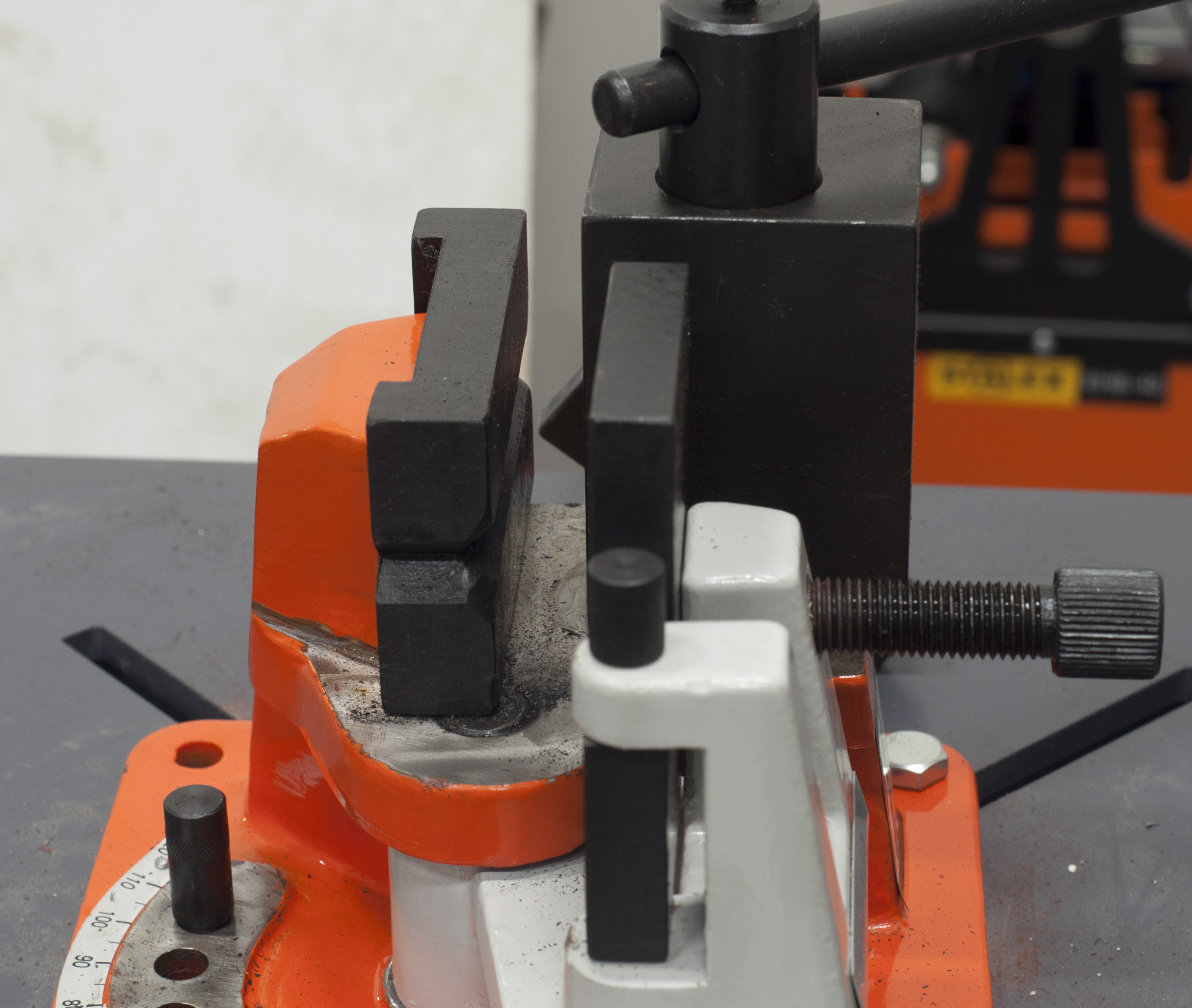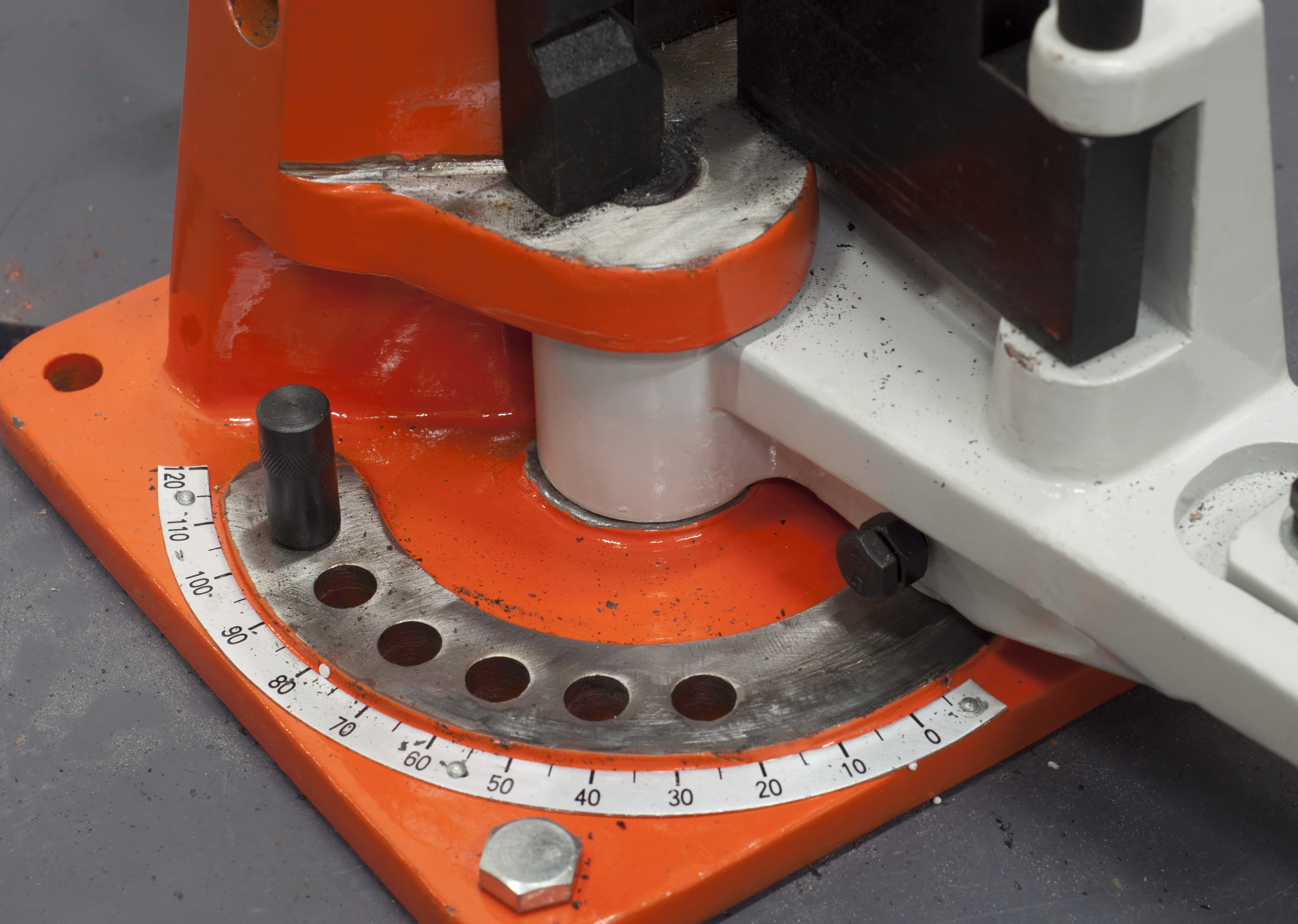 Ограничитель угла гиба и градусная линейка гибка на основании станка.