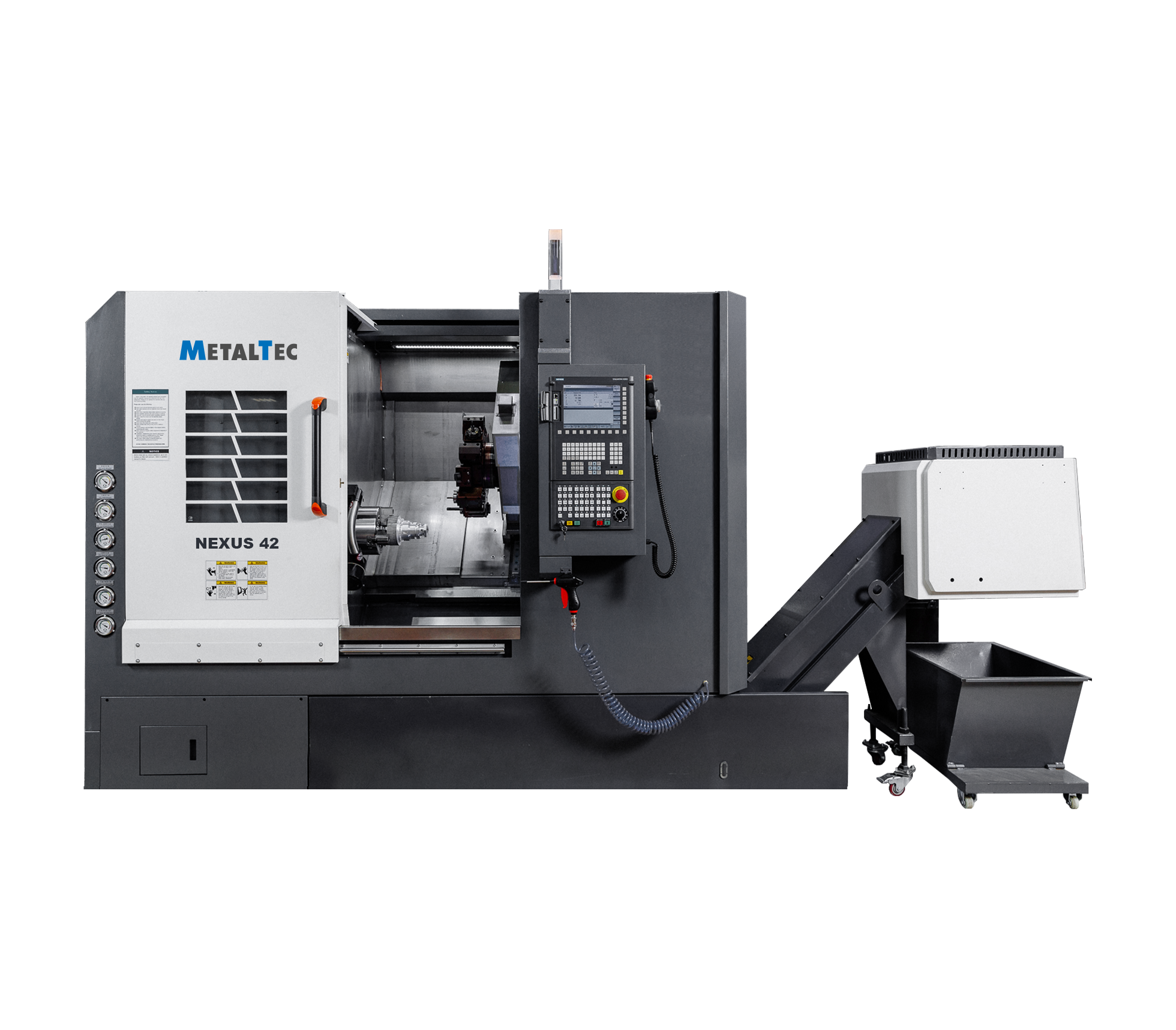 Удаляет стружку из станка и выпускает ее в идущую в комплекте тележку с минимальным выводом СОЖ. Необходимое решение для высокопроизводительного использования станка.