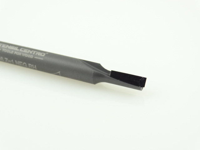 Твердосплавный корпус, алмазный (PCD) нож толщиной 3 мм (2-3 переточки). Небольшой отрицательный осевой угол ножа (минус 3-6 градусов),