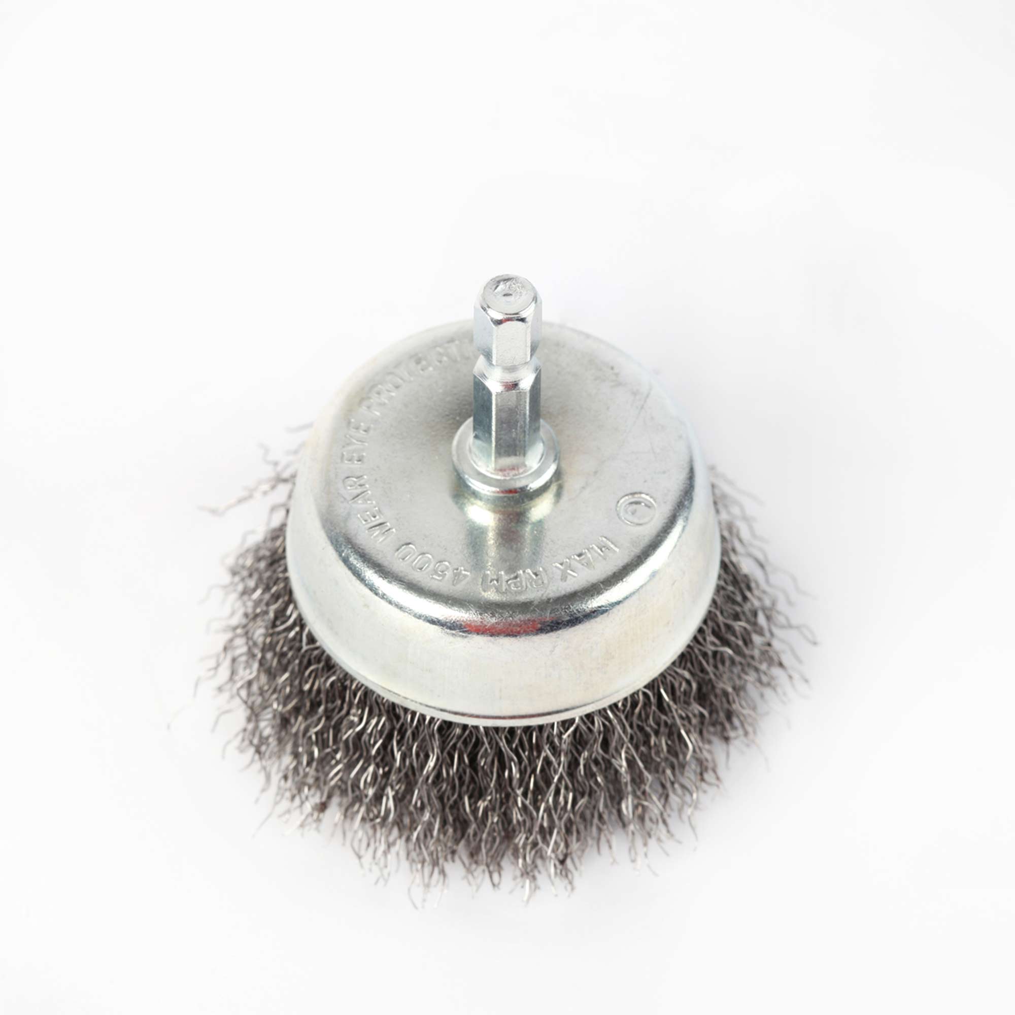 чашеобразная проволочная щетка для дрели; предназначена для снятия лака; краски; зачистки ржавчины; Наружный диаметр: 50мм; вал шестигранник; гофрированная проволока