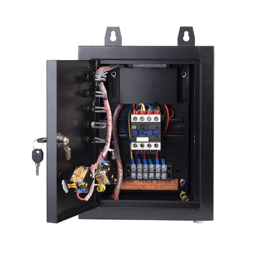• переключает силовой контактор на питание потребителей от сети при появлении сетевого напряжения.