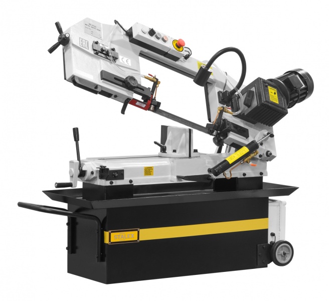 Станок Stalex BS-912G имеет поворот губок тисков, для пиления под углом необходимо изменять угол установки тисков, привод зубчатый. Зажим заготовки осуществляется тисками вручную, подача заготовки — также вручную. Мобильность станков позволяет использовать их на производстве непосредственно там, где это необходимо. Станки находят широкое применение в серийном и мелкосерийном производстве. Система СОЖ в стандартной комплектации.