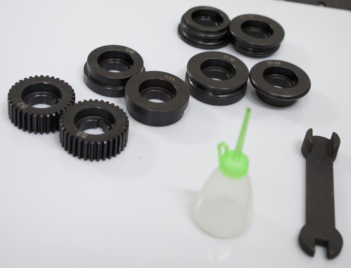 Комплектуется четырьмя наборами стандартных роликов для закатки кромок, отбортовки, изготовления S-образного профиля.