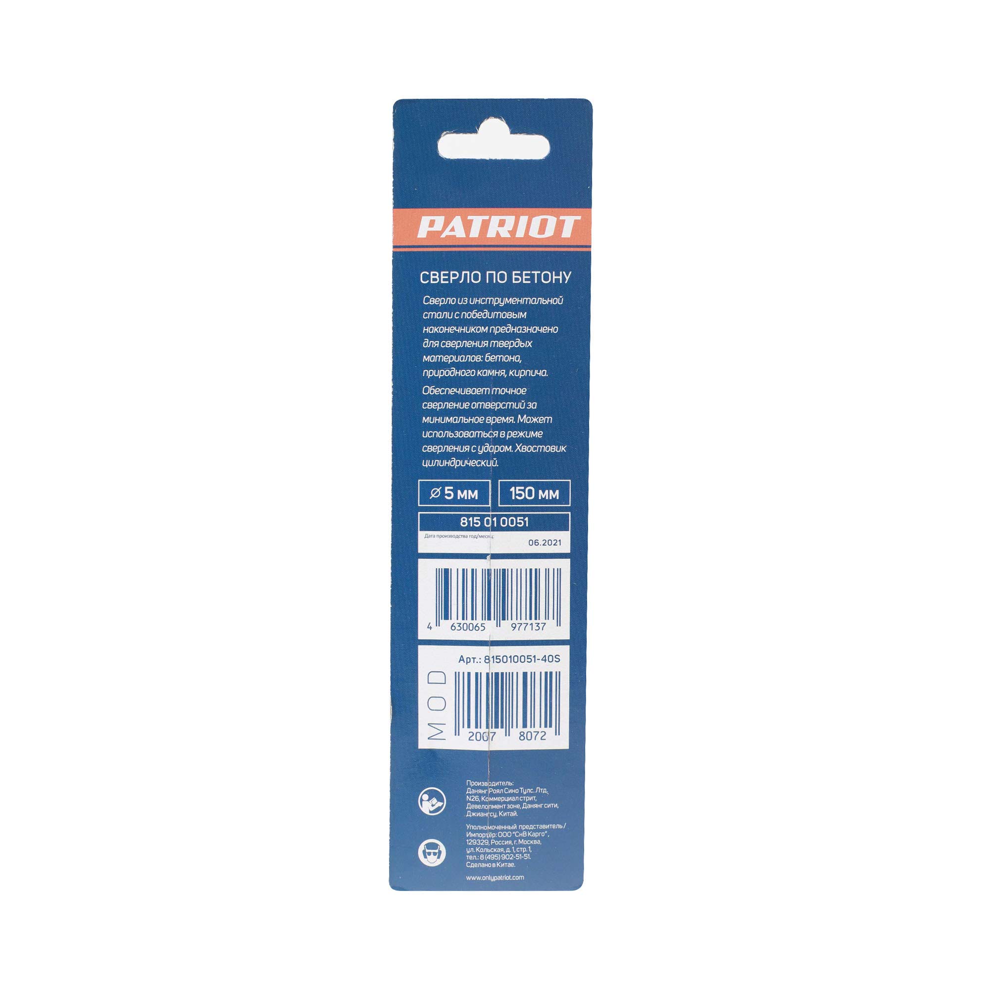 Наружный диаметр: 5 мм; Длина сверла: 150 мм; Обрабатываемый материал: бетон,кирпич