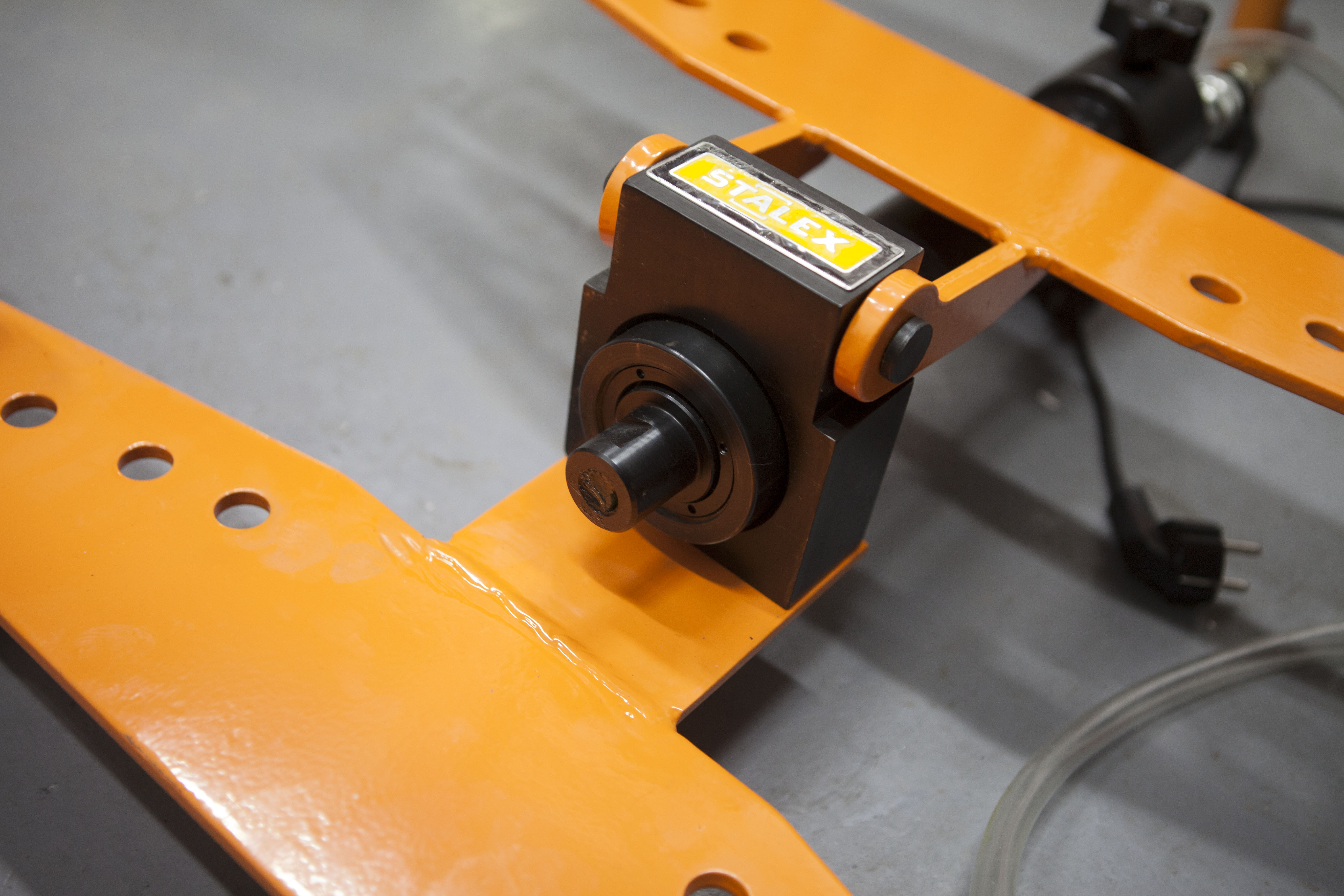 Модель Stalex EHPB-2D продавливает заготовки при помощи гидравлической направляющей, электродвигателя с набором сменных рабочих оправ. Помимо шести рабочих опор станок имеет две горизонтальные опоры, устанавливаемые в отверстия для регулировки радиуса гиба.