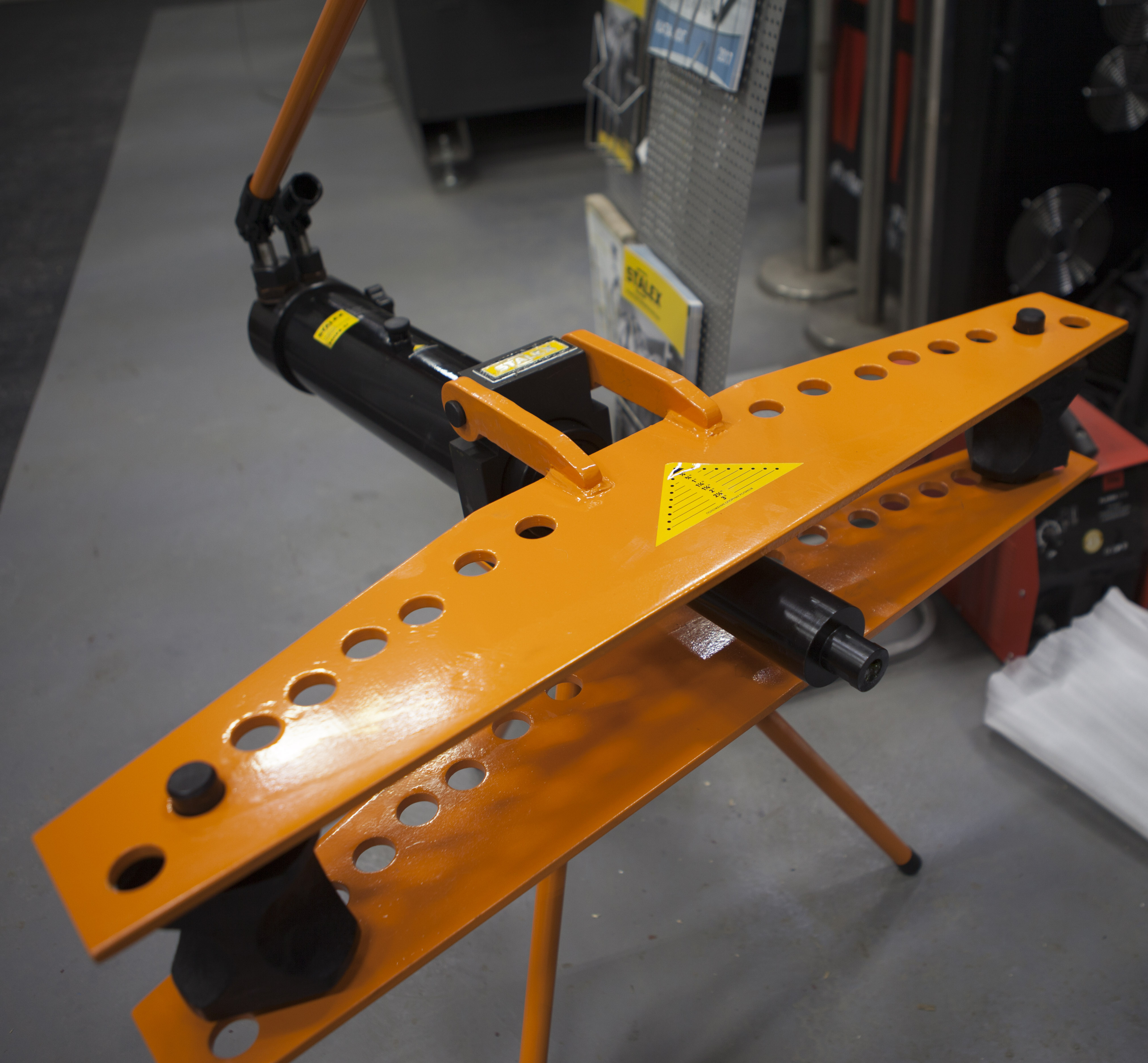 Модель Stalex MHPB-3J продавливает заготовки при помощи гидравлической направляющей, с набором сменных рабочих оправ. Помимо восьми рабочих опор станок имеет две горизонтальные опоры, устанавливаемые в отверстия для регулировки радиуса гиба.